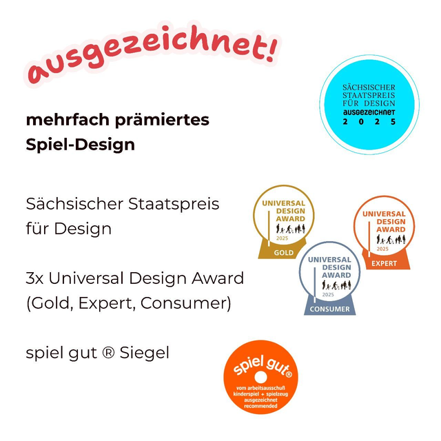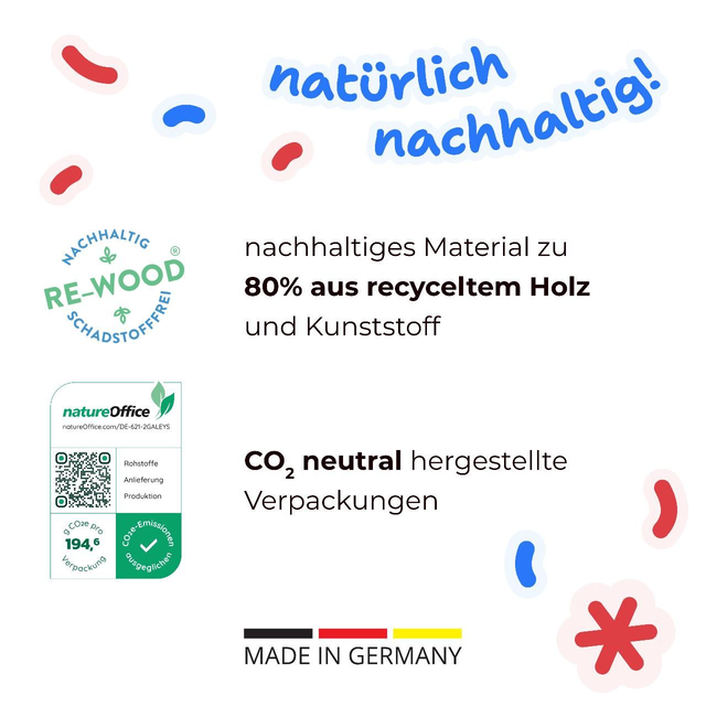 Das Spiel besteht aus 24 Spielsteinen aus ökologischem Rewood®. Sie sind lebensmittelecht, desinfizier- und abwaschbar sowie ohne Altersbeschränkung empfehlenswert. Rewood® besteht zu 80% aus Holzresten und ist immer wieder recycelbar. Made in Germany unter Einbeziehung von Menschen mit Behinderung.